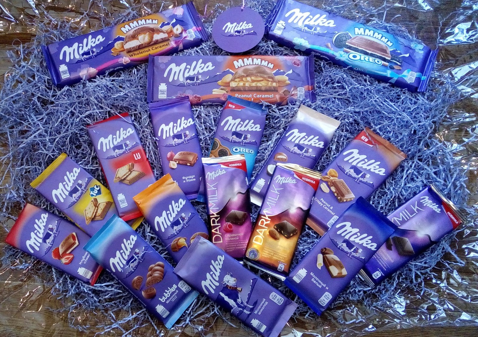 - Schokoriegel: Milka produziert Schokoladentafeln in verschiedenen Geschmacksrichtungen und Größen. Einige von ihnen enthalten Nüsse, Früchte oder andere Zusatzstoffe.